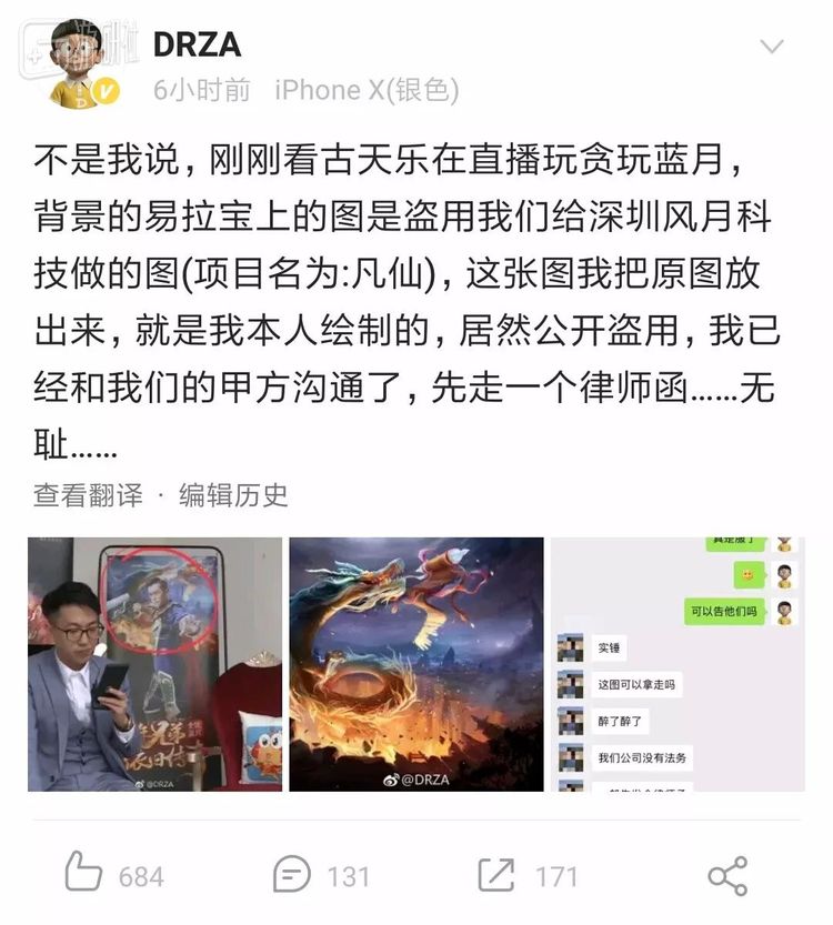 同时,微博上更有人爆出了这次直播中贪玩公司所用的背景海报盗用了自己画的图。