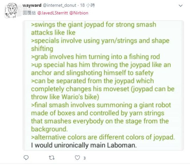而当Laboman出现在推特上之后,无疑也让世界各地的任粉眼前一亮:除去单纯的鼓掌叫好之外,有鉴于任天堂Labo本身极高的DIY潜质,网友们也纷纷向Javed提出了自己对Laboman的各路脑洞与创意。