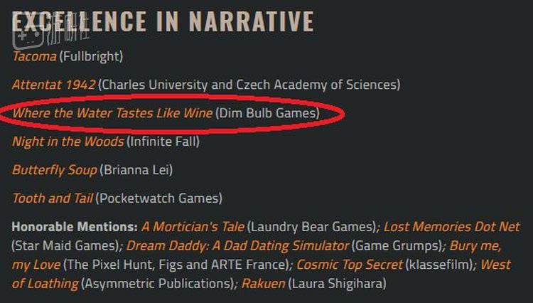 IGF于今年1月3日发布的“最佳叙事”游戏提名,红圈中为《这里水美似酒》