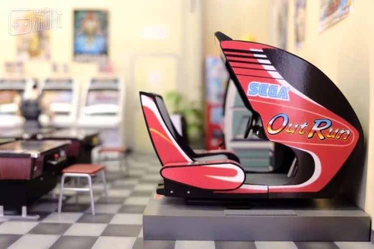 这边则是放了一台世嘉的《环游世界大赛车》(Out Run),这台机器就是能够整个底盘倾斜摆动的体感框体。在当年的机厅里,也算一个镇店之宝。
