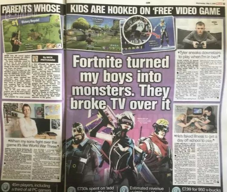 《太阳报》纸质版用了超过一个整版的篇幅为《堡垒之夜》做了专题报道,中央大标题为“《堡垒之夜》把我的小子们变成了怪物”