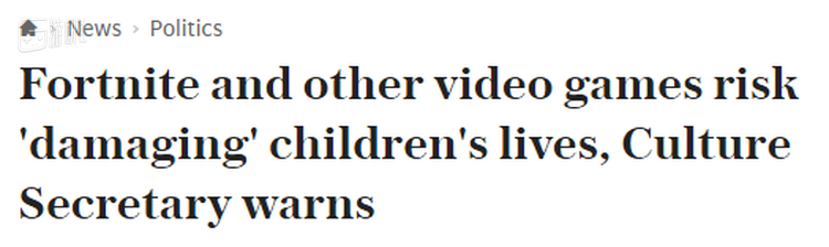 来自《每日电讯报》政治新闻板块,“文化部长警告:《堡垒之夜》和其他游戏可能‘损伤’孩子们的生活”