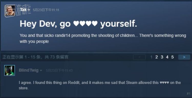 类似的声音并非个例,也并不仅仅来自于国际主流媒体。在这款游戏的Steam社区讨论页中,同样有一些声音认为这款游戏应该被Valve禁止上市。