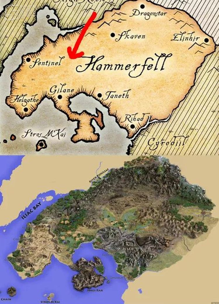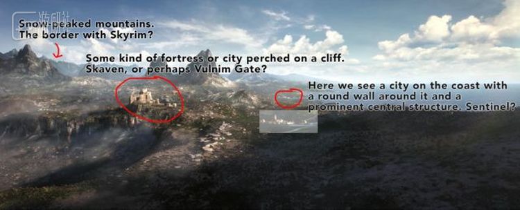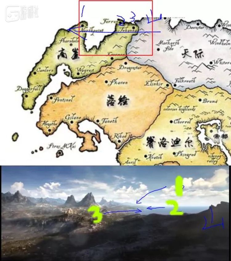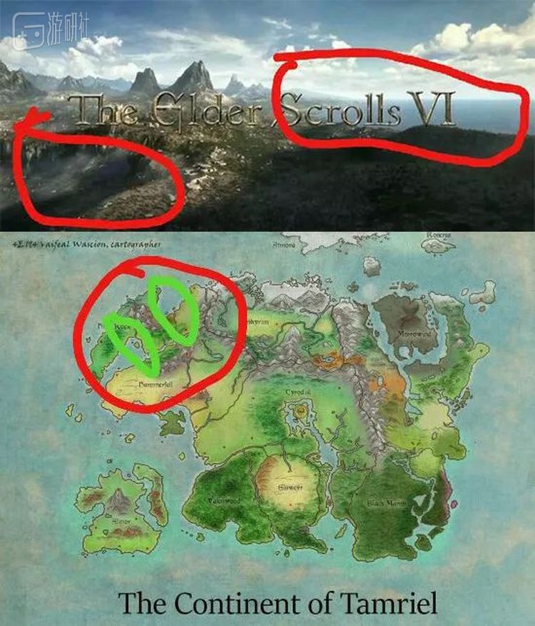 根据最后标题定格的航拍画面,有的玩家就猜测前方的海湾与后方下陷的地形正好与上古卷轴主舞台泰姆瑞尔大陆中高岩省的地形相符: