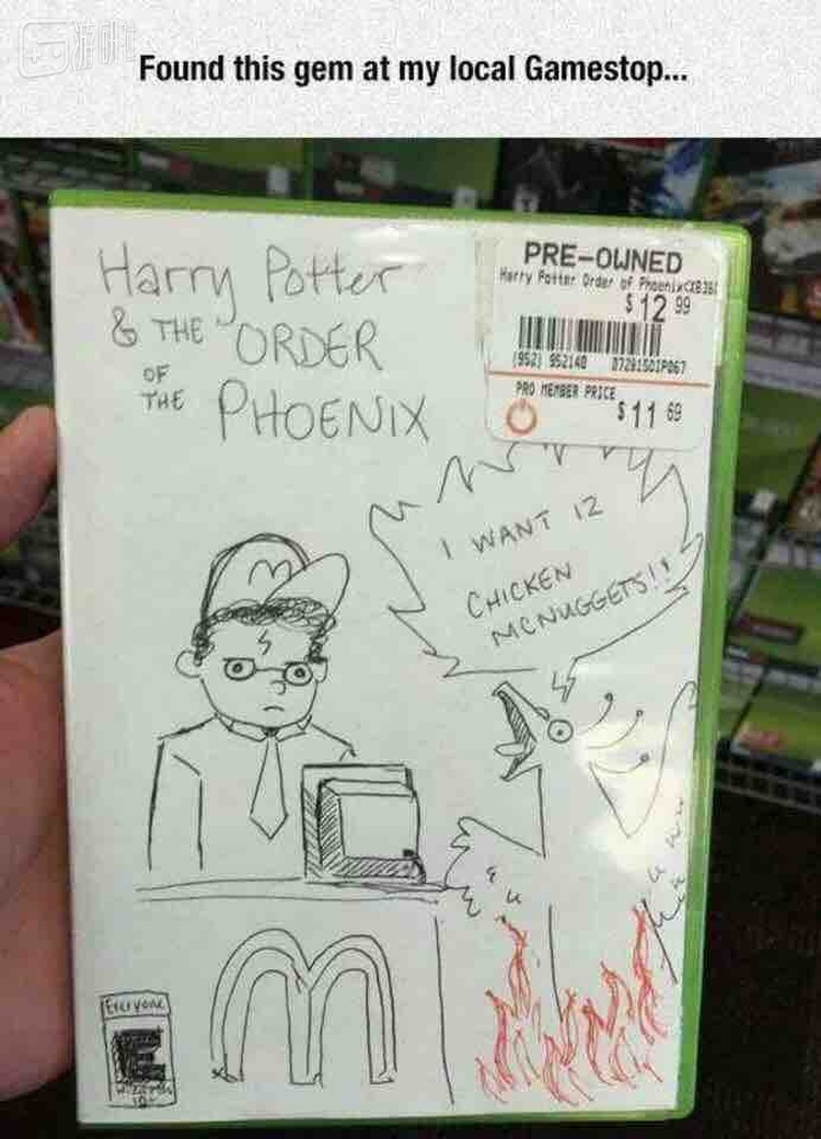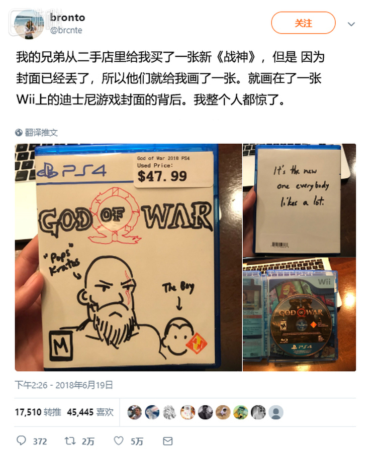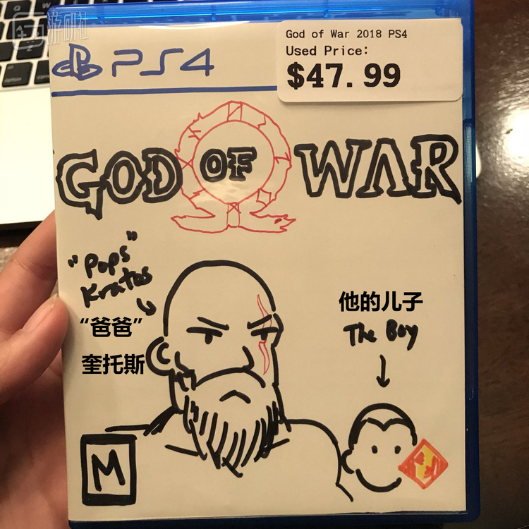 大意是说:“我的兄弟帮我在二手游戏店里买了一张战神,由于这张二手碟的封面已经丢了,所以店家不得不自己画了一张。”