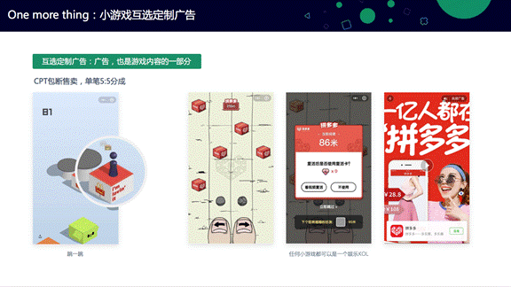 除了目前已上线的Banner广告与激励视频广告外,下一步,小游戏团队将开放小游戏互选定制广告,将广告融入游戏内容中,实现一体化更强,更优质的广告与游戏体验。