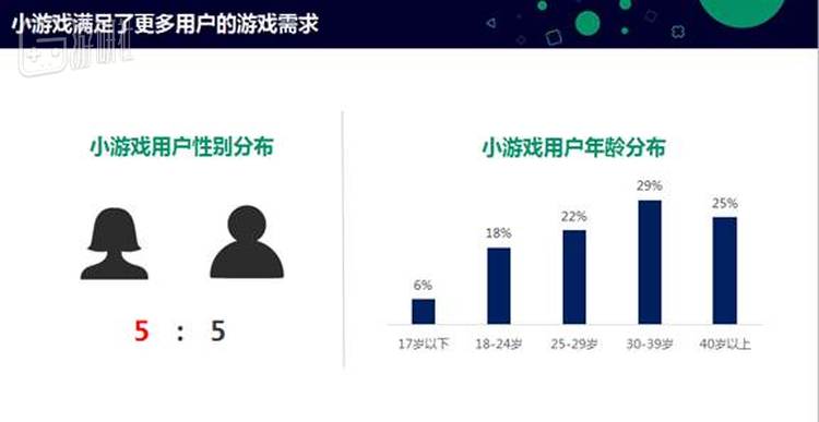 另外,小游戏性别分布比例较为均衡,男女比例五五开。同时在年龄分布上也呈现出集中于25岁以上用户的趋势。同时,官⽅鼓励开发者研发更多轻操作、社交性强、体验乐趣高、⼥性向的小游戏。