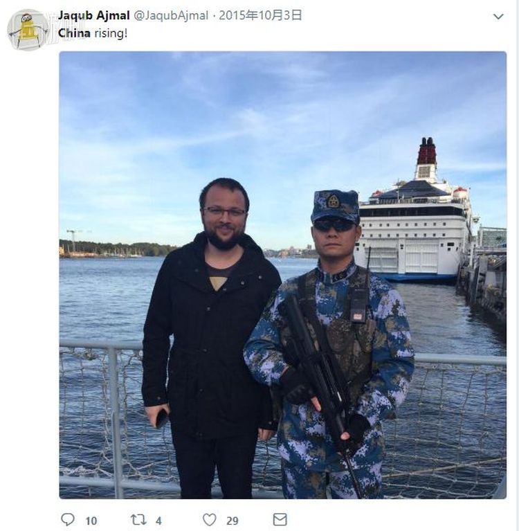 2015年,中国海军152舰队访问瑞典斯德哥尔摩港的时候,他还兴冲冲地与海军士兵合了张影,配文是“中国崛起!”