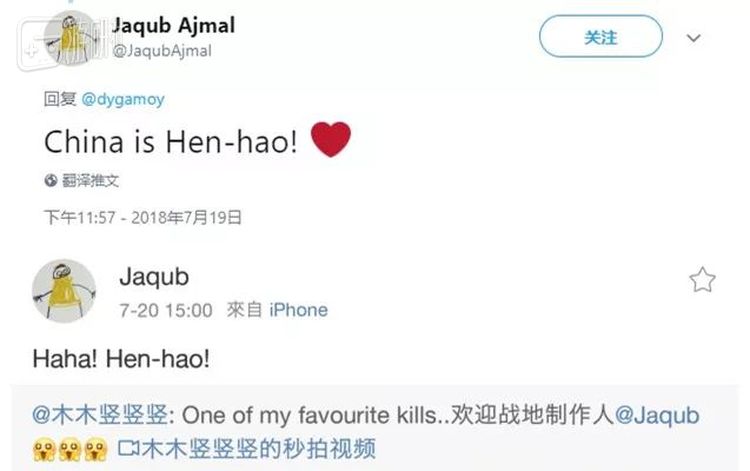 在被纠正拼法应该是"Hen-hao"以后,瑞典老哥略带委屈地表示他是个"loowai",果不其然又拼错了。不过Jaqub学习"Hen-hao"的速度非常快,这边被教育完,马上就回推特告知中文网友,"China is Hen-hao!"