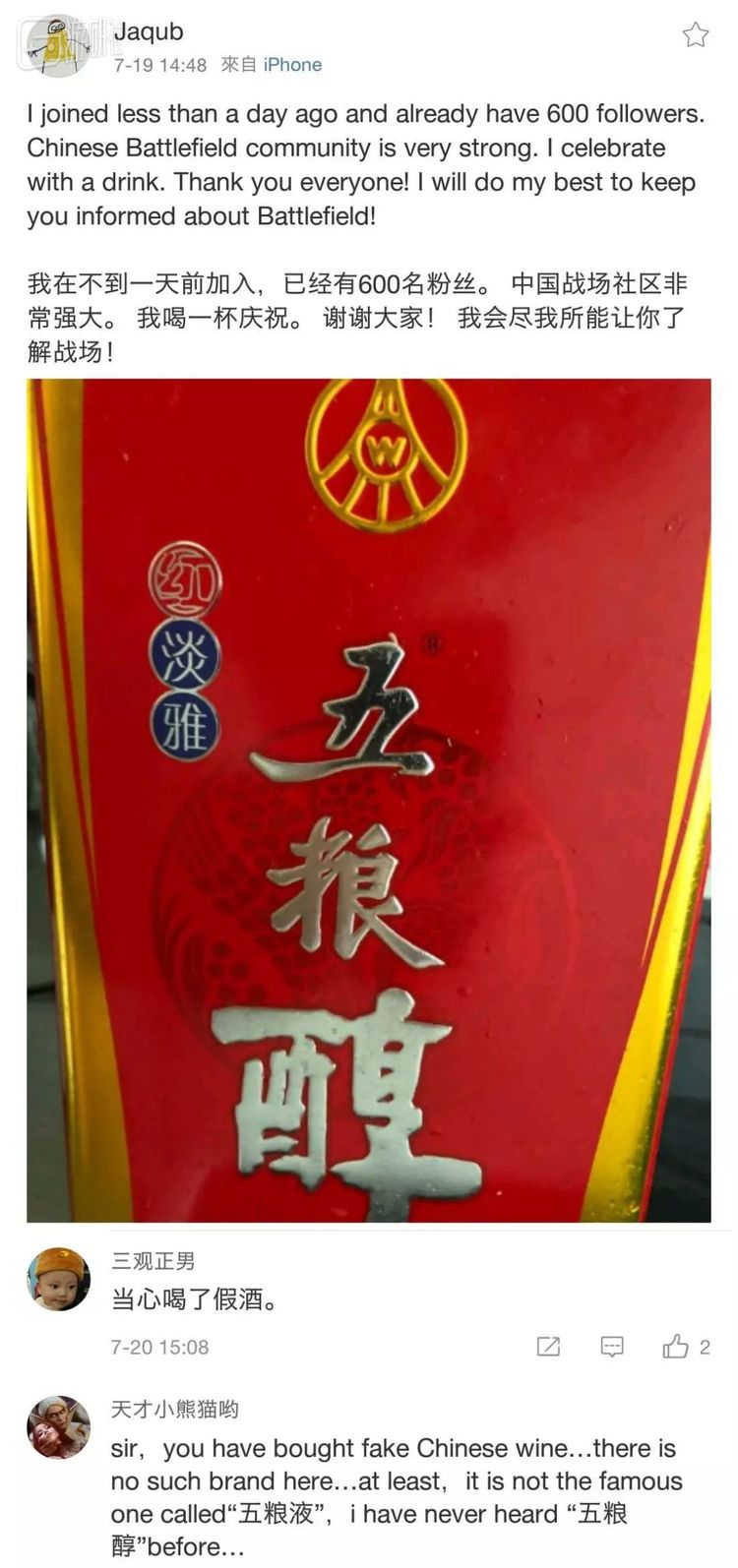 得益于微博上战地玩家的积极宣传,Jaqob的账号在不到24小时内就涨了600粉(今天已经一万多了)。这也让他的兴致十分高昂,不知道从哪弄了一瓶中国白酒,小酌庆祝。