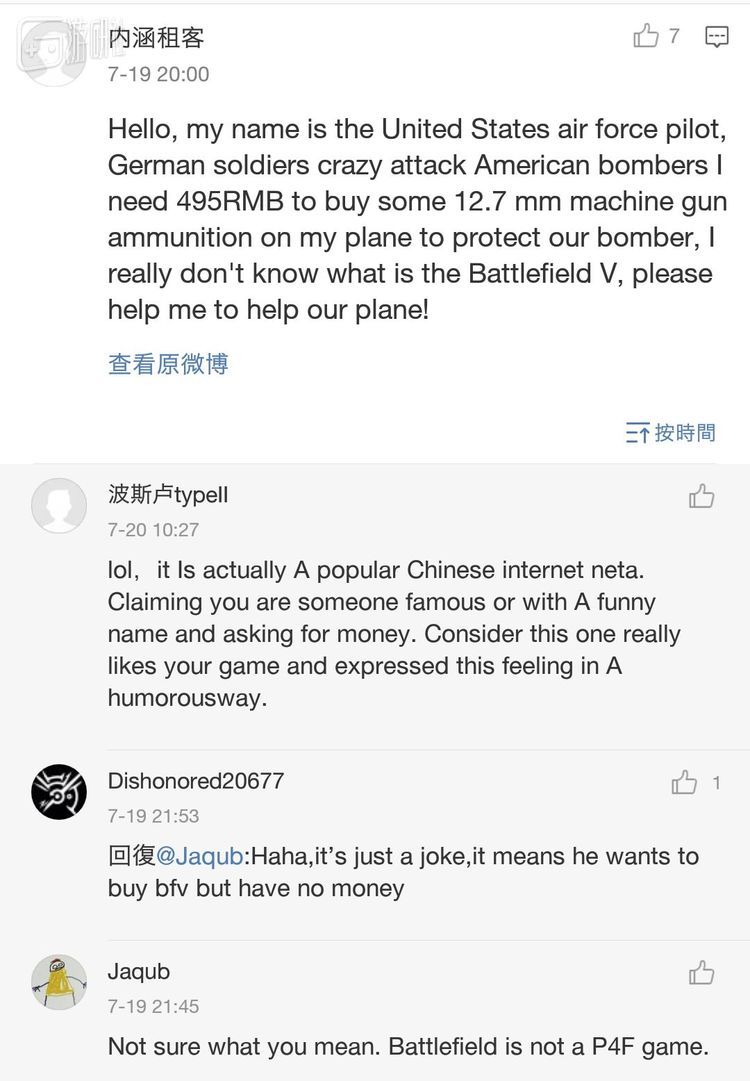 面对这种中文游戏圈盛行的“伸手要钱”段子,Jaqub有点发愣,只能礼貌地回答“我不明白你的意思,《战地》并不是一个免费游戏。”
