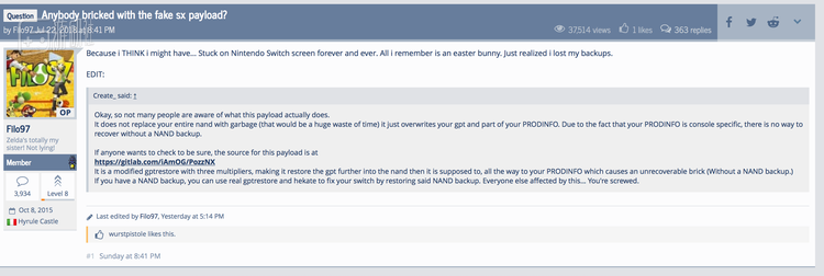 然后就出现了令人啼笑皆非的情况:不少玩家因为使用了假的破解软件(确切地说,是假的破解版破解软件)而导致自己的Switch变砖。他们以为自己下载到了免费版的SX OS,满心欢喜地装进了自己的Switch里,期待着不花一分钱就玩上游戏,等来的却只是这么一个悲伤的情况。