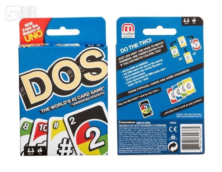 正如“UNO”这一单词指的是西班牙文中的“一”,“DOS”实际上就是西班牙文中的“二”。正因如此,官方在《DOS》的外包装上写了一句双关语:“世界第2的桌游”。
