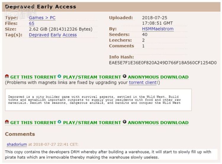 《Depraved》是一款以美国西部时代为背景的建造类模拟游戏,目前正在Steam上进行预售。近日,海外游戏网站TorrentFreak上的一篇关于游戏采用的反盗版措施的文章吸引了我们的注意力。