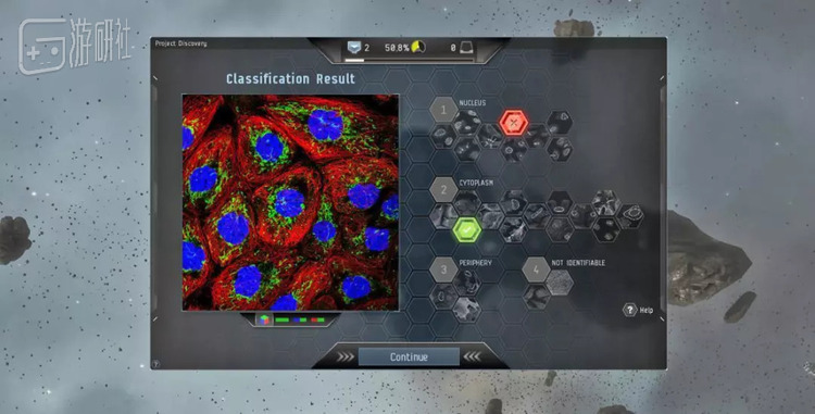 2016年,《星战前夜》(EVE online)上线了一款叫作“Project Discovery(探索计划)”的内置小游戏,玩家要参考教程去鉴定并分类1300万个人体细胞蛋白质染色图,进而获得丰厚的虚拟货币等奖励。