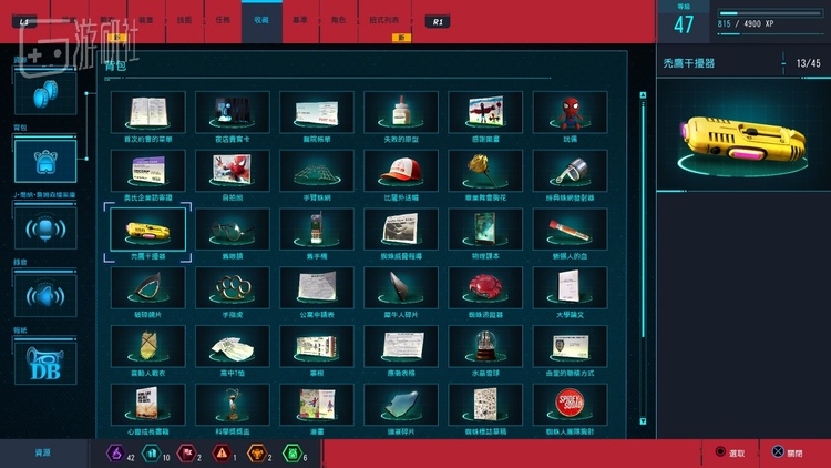 A:游戏地图在纽约曼哈顿全岛展开,收集要素相当繁杂,传统一点的有背包(纪念品,每一个都有一段简单介绍,回顾游戏开始前8年蜘蛛侠都经历了什么),地标,拍照,多种支线任务,技巧挑战,追逐小游戏,据点战和数量非常多的随机战斗等等,每一项收集要素都可以兑换代币来升级自己的装备。