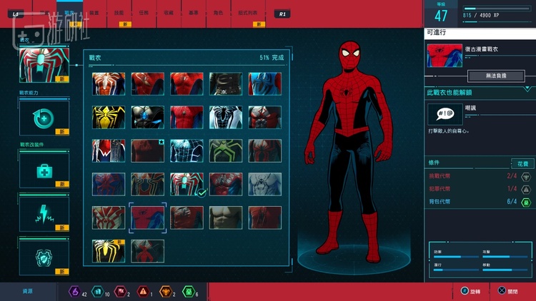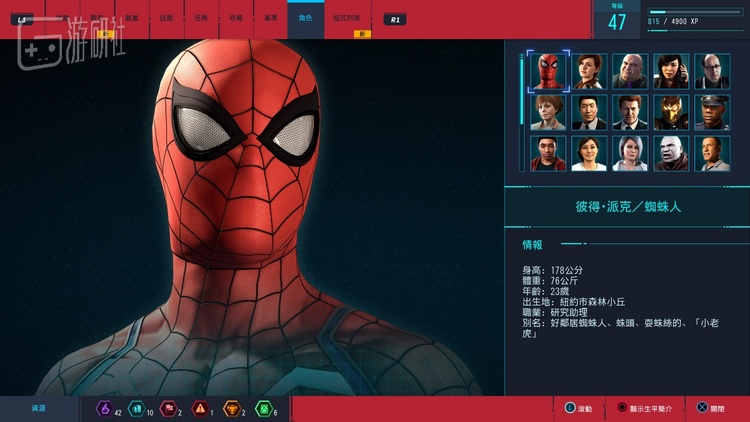 A:蜘蛛侠每次升级,都会获得固定的属性提升(比如攻击力,血量,摆荡速度等等)和技能点,随着剧情还会有8种战斗辅助道具解锁和升级,游戏最大的特色是“战衣系统”,每一套都来自经典蜘蛛侠漫画或者电影,而且每一套都有不同的大招,解锁之后并不与战衣绑定,可以随意切换,相信这足以唤起漫威粉丝们的好感。
