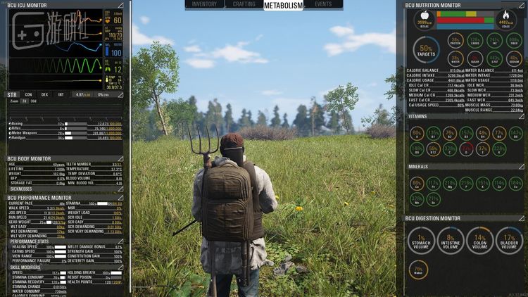 抛开建造、狩猎、物品合成这些在同类游戏中已十分常见的元素不谈,作为一款硬核生存游戏,《人渣》最大的特色在于,它拥有一个十分精细的人体模拟系统。在创建角色时,玩家可以自行调整自己角色的年龄和身材,不同的数值将决定游戏角色的属性和技能点分配。