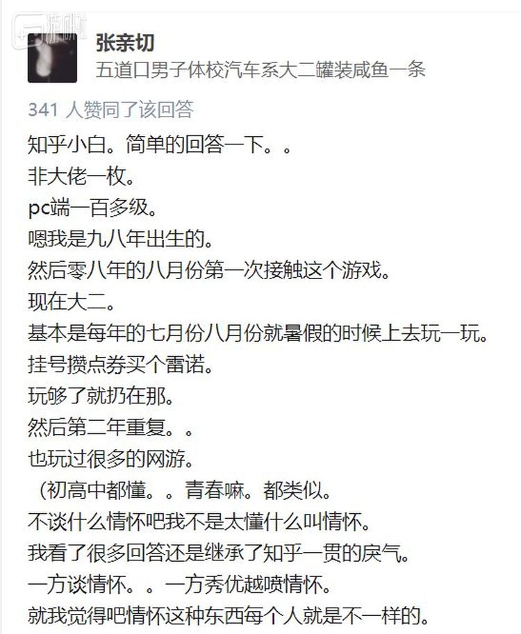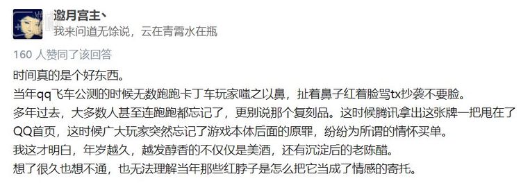 当时知乎上出现了一个问题叫“怎么评价腾讯的新手游《QQ飞车手游版》”,下面涌入了很多当年的端游玩家,追忆自己当年上学时候是如何喜欢玩飞车的,讲了很多过去的游戏经历,看着十分情怀。
