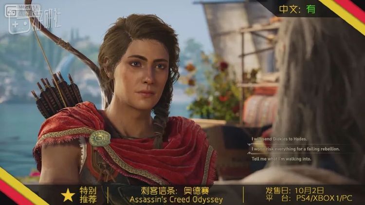 刺客信条奥德赛将背景设定在古希腊,玩家可以选择扮演男女两位主角之一进行游戏。本作中加入了对话选择系统,玩家所做出的选择一定程度上会影响结局,一些支线任务也会由对话触发。《黑旗》中的海战系统也将在这一作回归。