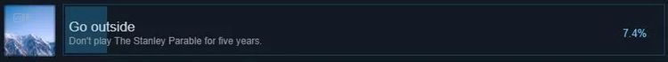 《史丹利的寓言》并不是第一个设置类似成就的游戏,在2011年上市的《孤岛危机2》里,就存在着一个名为“献身”的成就,它的达成条件是首次参加多人联机游戏之后过6个月再次玩同一模式。