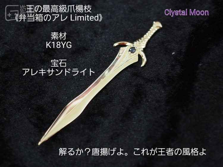 这样一个手工打造的武器牙签叉,普通版的是990日元(约60RMB),镶嵌宝石的版本就会提升到6200日元(约400RMB),也有这种使用18K金并镶嵌了“变石”的黄金版“兰斯洛特”,它的价格并不便宜,198000日元(约12000RMB)。