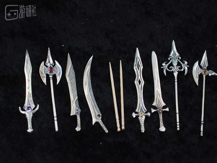 宝剑、战斧、弯刀,这些“牙签”都被做成幻想风武器的样子,每个上面还都镶嵌着各种颜色的宝石。