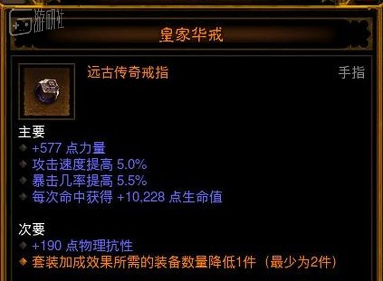 给没玩过的朋友解释一下,皇家华戒这件装备的效果是让你没达到套装需求件数的时候也能获得套装属性,相当于斗地主允许你把3456当顺子打出去,效果非常强力。