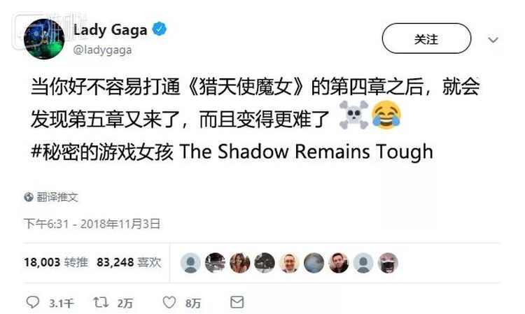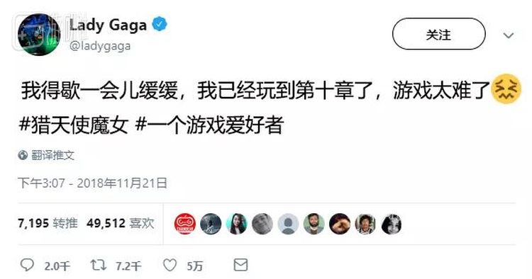 其实Lady Gaga对《猎天使魔女》的喜爱也是由来已久,早上一个月前,她就在推特上宣布自己正在玩这款游戏了,只不过当时她只打到了第四章,至于当时那条推文的内容嘛……跟最新的这一条差不多,同样是在抱怨游戏太难了:
