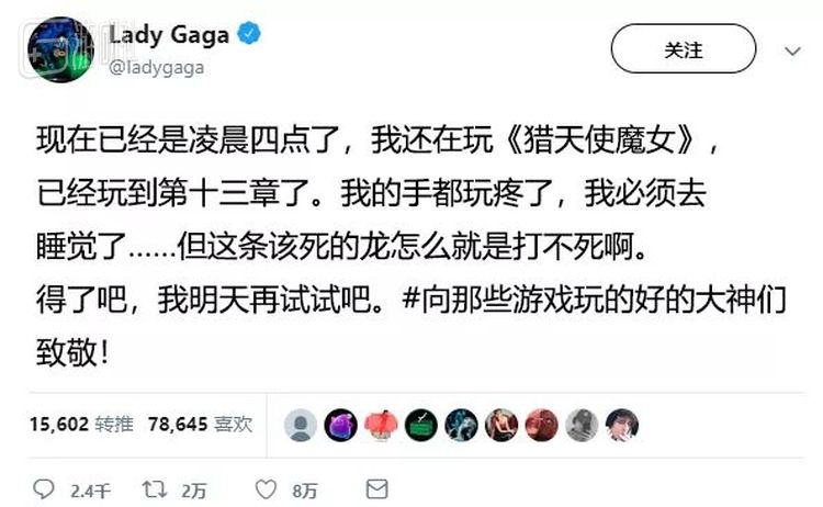 最新一位喜欢通宵玩游戏的明星就是“鳖姐”Lady Gaga,她玩的游戏则是《猎天使魔女》。11月24日凌晨,“鳖姐”在推特上向粉丝们汇报了自己的最新战绩:自己已经玩到第十三章了,手都疼了但还是死活打不掉这一关的Boss。在推文的最后,她还专门向游戏大神们表达了致敬。