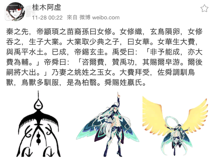 当然,戏说不是胡说,改编不是乱编,FGO在美术上还是做了相当多的功课的。看似浮夸的秦始皇造型,其实参考了商王朝的玄鸟图腾: