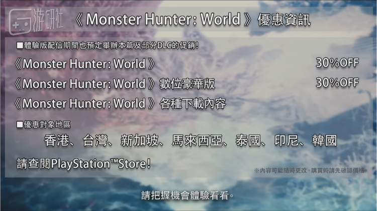卡普空将为玩家们提供《怪物猎人:世界》体验版下载。体验版包括游戏序章内容,玩家在体验版中的存档可以继承至正式版中。体验版配信时间为2018年12月12日至2018年12月17日。