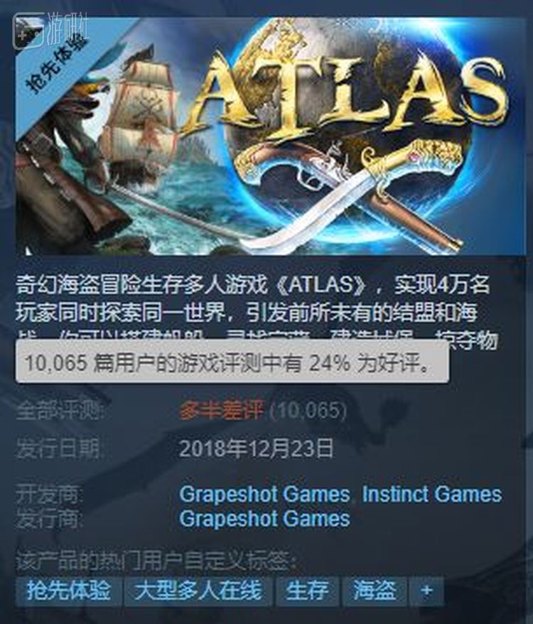 航海主题的多人生存游戏《ATLAS》发售不足两天,收获了一万多条评论,其中只有24%为好评。