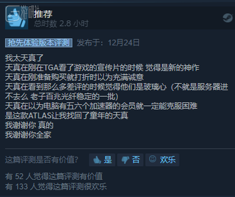 既然差评都是因为“玩不上”,那么玩上了《ATLAS》的人对这个游戏的评价又如何呢?