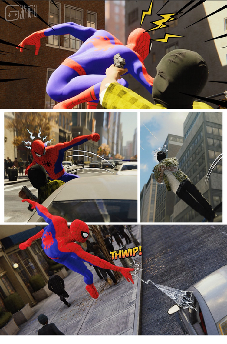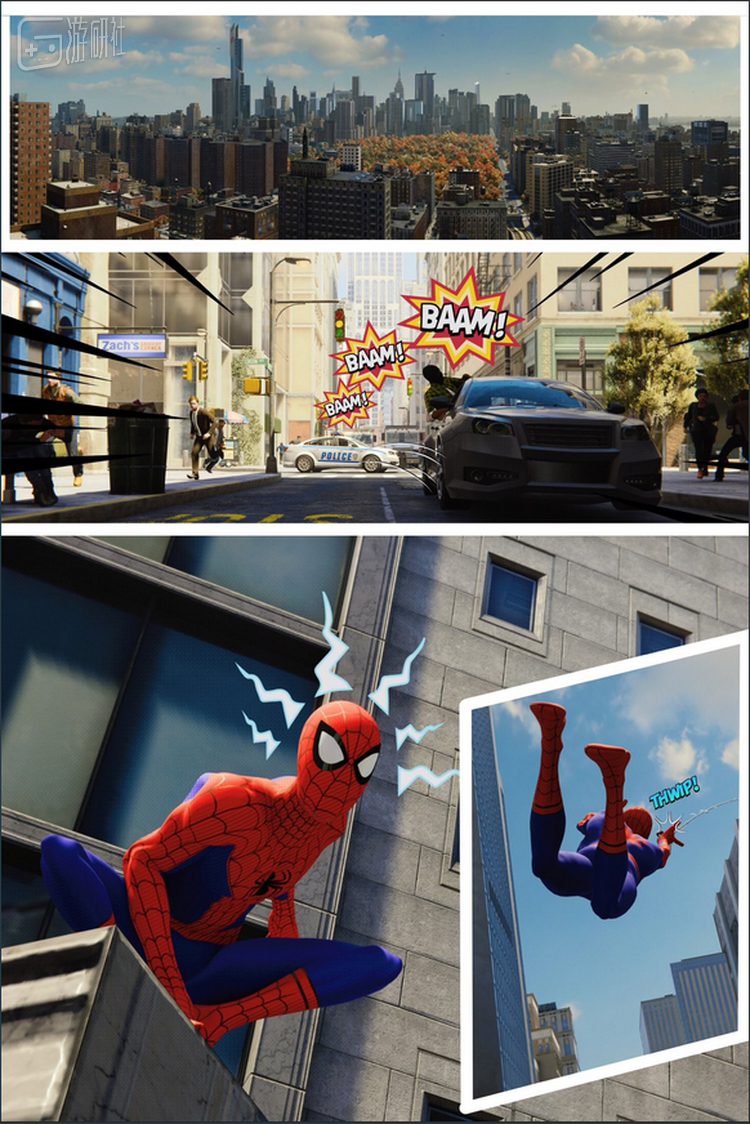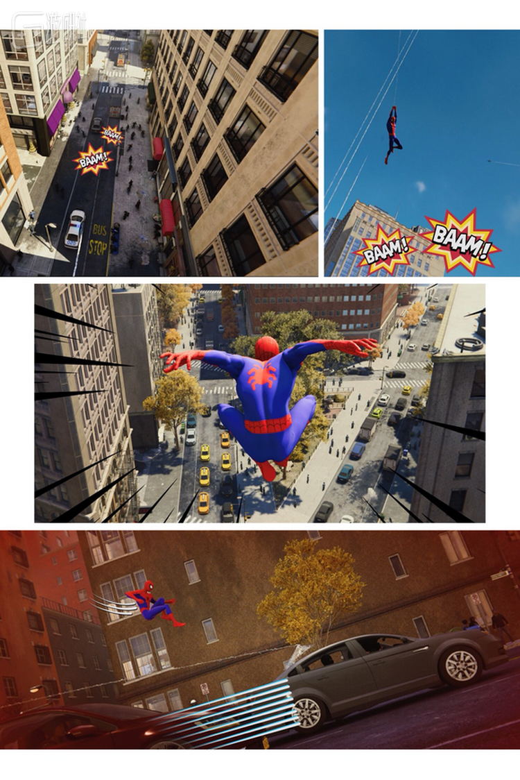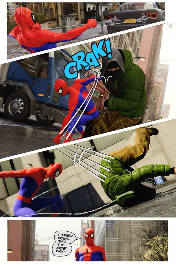 在这套漫画中,帕特里克展示出了《漫威蜘蛛侠》拍照模式的更多可能性。他让蜘蛛侠在游戏中摆出各种各样的姿势,然后巧妙的调整蜘蛛侠在画面中的位置以完成分镜设计,并尝试调整画面的色彩来营造卡通效果。