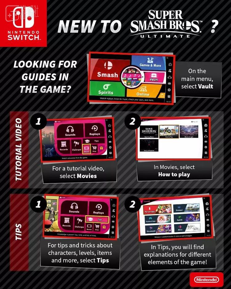 面对玩家的抱怨,任天堂欧洲分部昨天在官方推特上特地发布了一张教程,内容十分简单,就是教玩家怎样找到“大乱斗”的内置教学内容。