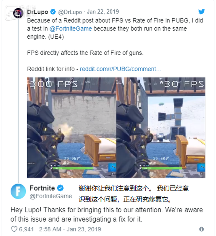 这件事到这还没算完。有玩家跑去测试同类型另一款热门射击游戏《堡垒之夜》,居然发现了相同的问题。测试者用冲锋枪射击墙壁,结果高帧率下墙壁要更快被射碎。视频在推特发布后,得到了《堡垒之夜》官方的回复。官方表示这确实是个失误,他们将会很快修复这个问题。