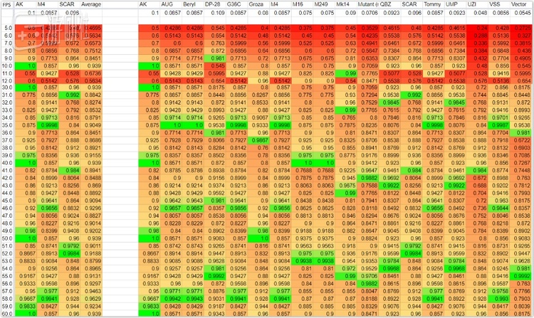 经过一系列复杂的计算和验证,最后MutuTutu得出了一张表格,记载着每种武器在不同帧率下的表现。表格显示,在《绝地求生》中,帧率低或者高都不意味着枪械的伤害更高。每把枪都有一个“最佳帧率”,在最佳帧率下,枪的后坐力和射速表现才是最好的。