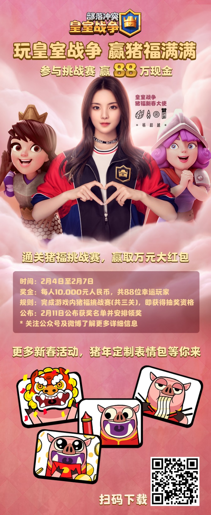 皇室战争新春猪福挑战将从2月4日持续至2月7日,在3关挑战中,会将全新的“猪福满满”模式和选卡模式、经典卡组模式进行结合,完成3关挑战即可获得88万人民币现金抽奖机会。