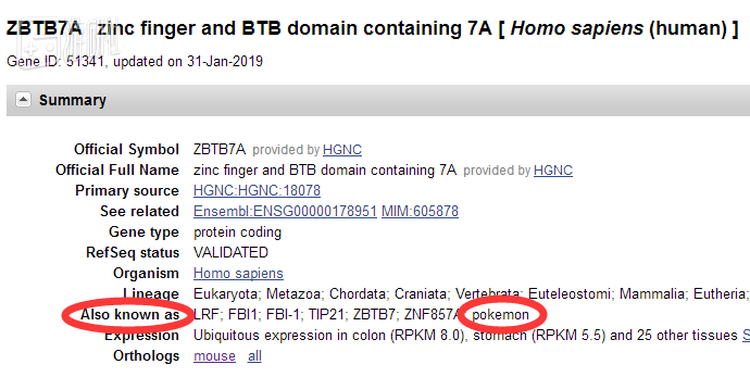 已经更改后的基因检索页面:Zbtb7,别名pokemon