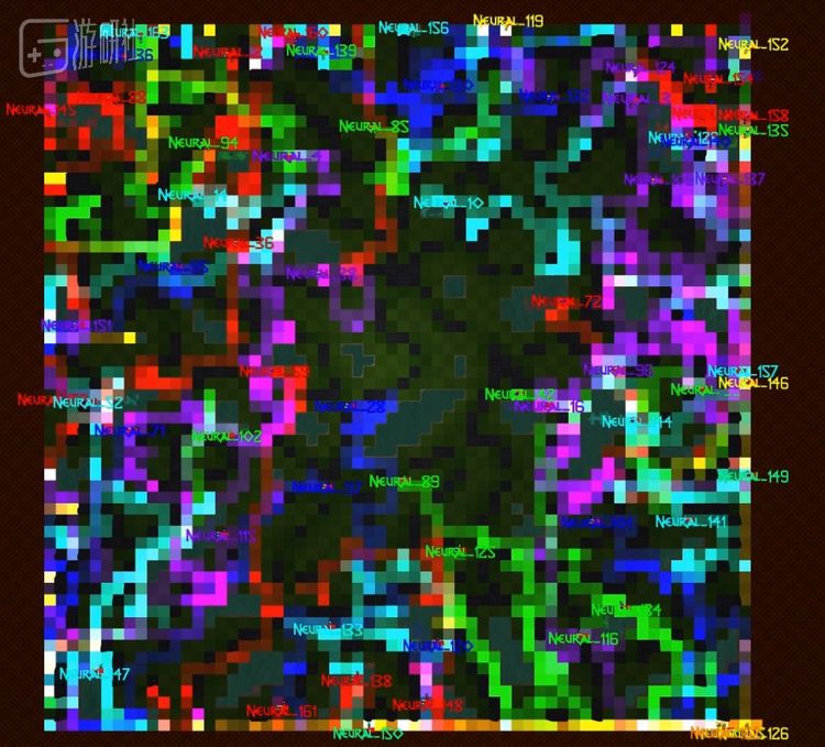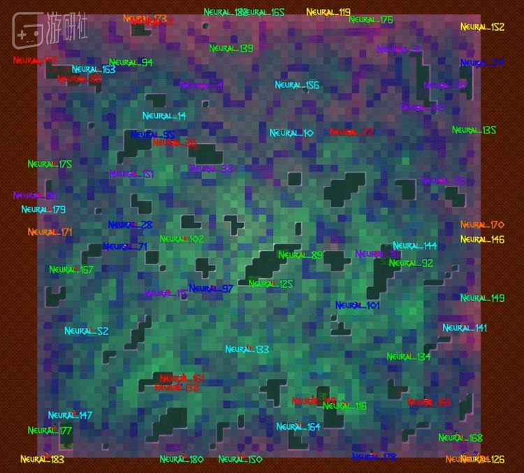 这个游戏被命名为“Neural MMO”(神经MMO)。最多128名AI会作为玩家降生在游戏地图的边缘。世界中有可以通行的草地、森林和无法通过的水域、岩石。AI有饥饿度和口渴度,在森林方块可以获得食物,在水方块可以获得饮水。水是无限的,但森林方块能够提供的食物是有限的,被吃完后必须等很长一段时间才能回复。