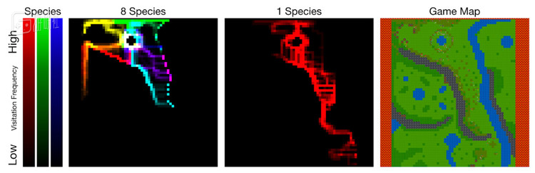 这张图对于人工智能专家和普通人来说都没什么特殊意义,但是生物学家,尤其是研究生物行为的学者会发现,AI们的行为非常接近自然界中不同动物种群的活动。