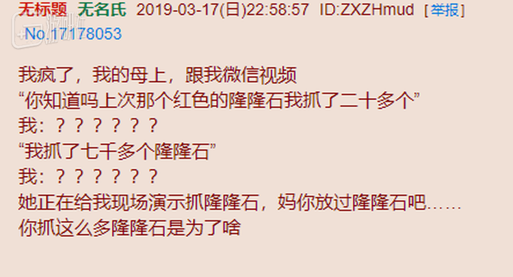 上一个报道,老人们身兼数台手机,踏遍全城只为捕捉一只稀有的宝可梦。而在这个故事里,作者的母亲不依不饶捕捉了七千只同样的宝可梦,而且只是再普通不过的“隆隆石”而已。