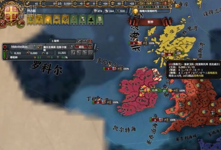 但是有些懂得审时度势的玩家,会借着拜占庭开局时余威尚存的海军,飘扬过海,突袭……爱尔兰。此时英国正在忙于和法国交战无暇西顾,占领全岛以后,进可以继续和奥斯曼死磕,退可以放弃首都,等待以后复仇。