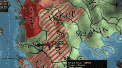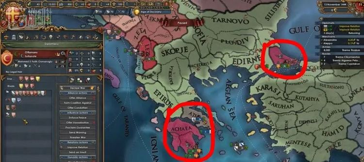 另一方则是有名无实的拜占庭“帝国”。虽然也叫做帝国,但是在游戏开始的1444年,拜占庭只剩下巴掌大的希腊领土和已经成为孤城的首都君士坦丁堡。