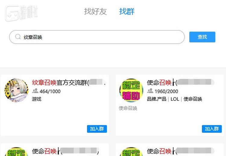 在QQ中搜索“纹章召唤”的第一个结果就是“官方交流群”,其他的都是“使命召唤卖挂群”