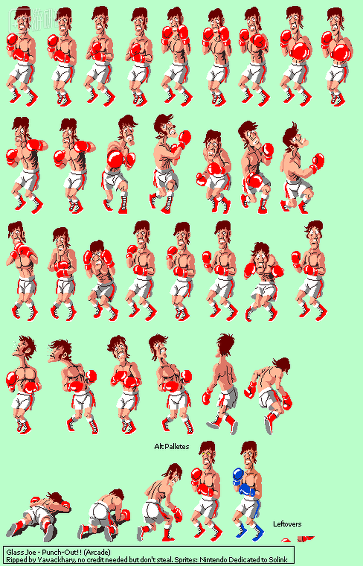当时开发游戏还没有现在这么多方便的工具,角色的这种像素图全部都要先在网格纸上画好。由于《Punch-Out!!》里的角色本来就要比其他游戏大得多,因此绘制角色用的网格纸都得有一张桌子那么大,使用的格子数自然也比别的游戏多得多。