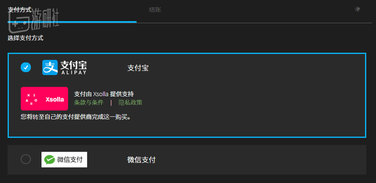 接下来是测试支付功能。在支付页面,国区用户可选支付宝/微信支付作为支付方式——也只能选择支付宝/微信支付,商城不支持国区用户使用最基础的信用卡结算 ,这不免让人感到有一点点奇怪。