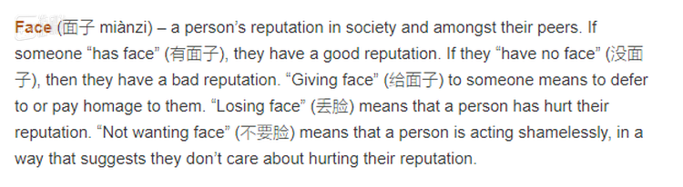 连“面子”这个词都衍生了一门学问。为了能够便于理解,出教程者不得不详尽地解释“有面子”等于“有声誉”,或是“不要脸”等于“无耻且不关心自己的声誉”。