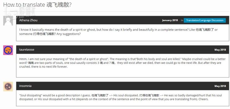 此外,中文特有的一些四字成语也难倒众人,例如“魂飞魄散”就曾让一位译者十分困扰。这位提问者表示自己明白“魂飞魄散”代表着什么意思,但却无法用合适恰当的英文去形容。而在网友翻来覆去讨论之后,整个帖子里也就“The soul shatters into pieces”这个回答比较贴切。